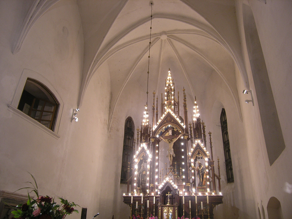 repasované historické žárovkové osvětlení oltáře z doby elektrifikace kostela (1931), s povrchovou kabeláží, vláknové žárovky