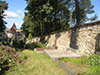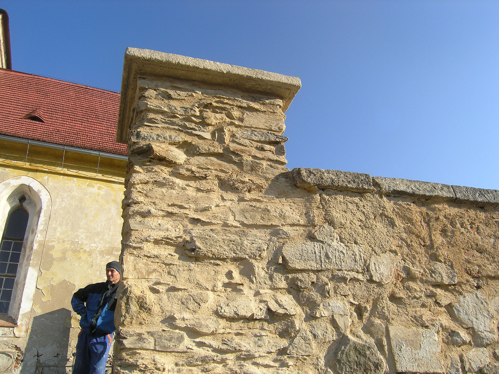 Statické zajištění historické hřbitovní zdi, včetně přezdění rozsáhlých úseků, včetně pilířů vstupní brány.